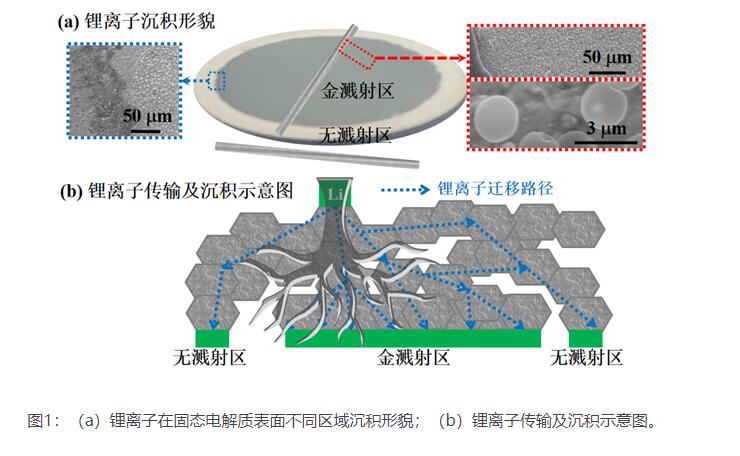 為此,科研人員通過將電解質(zhì)兩側(cè)金屬鋰電極設(shè)計(jì)成互為垂直結(jié)構(gòu),構(gòu)筑了非對(duì)稱結(jié)構(gòu)的固態(tài)電池(圖1a),通過觀察鋰在電解質(zhì)表面沉積狀態(tài)來推斷鋰離子在電解質(zhì)內(nèi)部的傳輸過程。同時(shí),在電解質(zhì)表層中心區(qū)域?yàn)R射Au原子層,通過與未濺射Au原子層區(qū)域相比較,獲取Au原子層對(duì)鋰離子沉積的影響規(guī)律。研究結(jié)果表明,電解質(zhì)表層的電子分布狀態(tài)會(huì)直接影響電解質(zhì)內(nèi)鋰離子的傳輸路徑(圖1b),使得來自電解質(zhì)上表層的鋰離子在電解質(zhì)內(nèi)呈發(fā)散狀傳輸。進(jìn)一步分析發(fā)現(xiàn),在未濺射Au濺射區(qū),鋰離子沉積呈現(xiàn)為無規(guī)則區(qū)域富集分布狀態(tài)(圖1a中藍(lán)框內(nèi)左側(cè)區(qū)域),將誘導(dǎo)鋰枝晶生長進(jìn)而誘發(fā)短路現(xiàn)象發(fā)生。而在濺射有Au原子層區(qū)域,鋰離子沉積呈現(xiàn)為均勻球形顆粒分布狀態(tài)(圖1a中紅框區(qū)域及藍(lán)框內(nèi)右側(cè)區(qū)域),有效抑制了由于鋰枝晶的生長帶來的鋰離子電池的安全隱患。該工作的開展為全固態(tài)電池界面性能優(yōu)化及安全性能提升提供了理論與實(shí)驗(yàn)基礎(chǔ)。