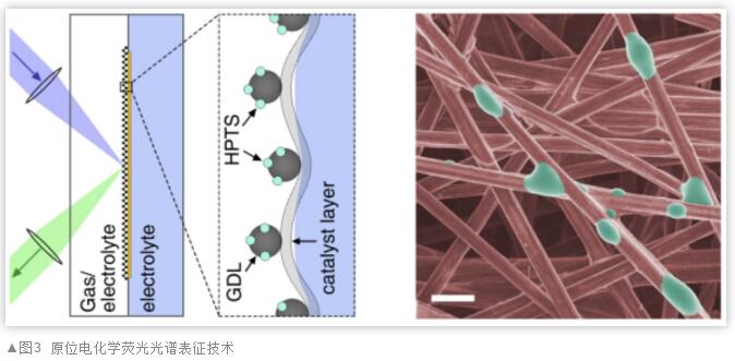 為了探究CO2分子在催化反應(yīng)界面處的擴(kuò)散傳質(zhì)過程,本文基于對(duì)CO2分子具有特異性熒光響應(yīng)的探針分子(HPTS),在國際上首創(chuàng)了原位電化學(xué)熒光光譜表征技術(shù)。通過該技術(shù),可以在電催化反應(yīng)過程中實(shí)時(shí)地檢測CO2分子的界面濃度。