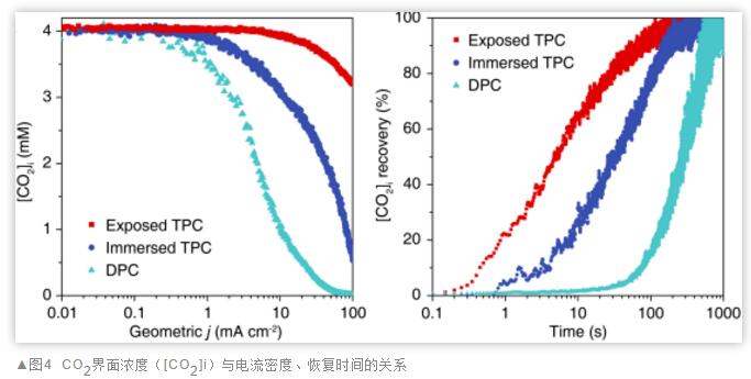 本文設(shè)計(jì)了三種電催化體系,分別是敞開的三相體系(Exposed TPC)、液下三相體系(Immersed TPC)以及H型兩相體系(DPC),對(duì)比了它們?cè)陔姶呋^程中的CO2界面濃度變化規(guī)律。結(jié)果發(fā)現(xiàn),敞開的三相體系在電流密度達(dá)到100 mA cm-2時(shí),依然保持了80%的CO2界面濃度,而電解停止后的CO2界面濃度恢復(fù)速率也遠(yuǎn)高于其它兩種體系。經(jīng)過計(jì)算,三相體系的CO2界面質(zhì)量轉(zhuǎn)移系數(shù)是兩相體系的13倍,電解時(shí)的CO2界面濃度是兩相的35倍。由此可以推斷,經(jīng)過浸潤性優(yōu)化后的三相催化體系能夠有效穩(wěn)定CO2分子的界面濃度,是保證其在大電流密度下具有較高催化選擇性的關(guān)鍵因素。