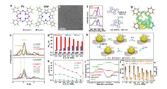 最近,在國(guó)家自然科學(xué)基金委、科技部和中國(guó)科學(xué)院的支持下,胡勁松課題組在氮摻雜碳類CO2RR催化機(jī)制研究方面取得重要進(jìn)展,發(fā)展了顯著提高其性能的新策略。氮摻雜碳基納米材料作為廉價(jià)非金屬CO2RR催化劑備受關(guān)注,但因其結(jié)構(gòu)復(fù)雜,難以精確控制,導(dǎo)致對(duì)其催化活性位點(diǎn)的認(rèn)識(shí)仍存在較大爭(zhēng)議,催化性能也亟待大幅提升。利用結(jié)構(gòu)明確的小分子作為模型催化劑是明晰其催化機(jī)制的有效手段,但小分子自身的催化活性低,實(shí)驗(yàn)誤差大,難以給出可信結(jié)果。研究人員發(fā)現(xiàn)將含氮小分子模型催化劑(酞菁(Pc)和四苯基卟啉(TPP),圖a)與超小鈷納米晶(圖b,c)結(jié)合,可以顯著提升其催化CO2RR的選擇性(法拉第效率,圖d)和活性(電流密度,圖e)(-0.9 V下分別提升18和47倍)。這種放大效應(yīng)使利用模型小分子揭示氮摻雜碳類材料的催化機(jī)制成為可能。實(shí)驗(yàn)結(jié)果與理論計(jì)算表明CO2RR優(yōu)先發(fā)生在吡啶氮而不是吡咯氮上(圖f-h);而且金屬態(tài)鈷可以顯著降低吡啶氮上CO2RR決速步驟的能壘,從而提升其催化性能(圖i)。電化學(xué)實(shí)驗(yàn)進(jìn)一步證實(shí)含吡啶氮的酞菁分子催化CO2RR的活性和選擇性都比只含吡咯氮的卟啉分子在相同氮含量下高出數(shù)倍(圖j)。這些結(jié)果揭示了氮摻雜碳類催化劑中吡啶型氮碳位點(diǎn)電催化還原CO2性能明顯高于吡咯氮摻雜碳位點(diǎn),并且通過調(diào)控吡啶型氮碳位點(diǎn)電子結(jié)構(gòu)可以顯著提升其催化活性與選擇性。該研究工作為合理設(shè)計(jì)高效、低成本CO2RR碳基電催化劑提供了有益的參考,相關(guān)結(jié)果發(fā)表于德國(guó)應(yīng)用化學(xué)(Angew. Chem. Int. Ed.2020, Doi: 10.1002/anie.201916520),并被選為VIP論文。論文第一作者是博士生何超。