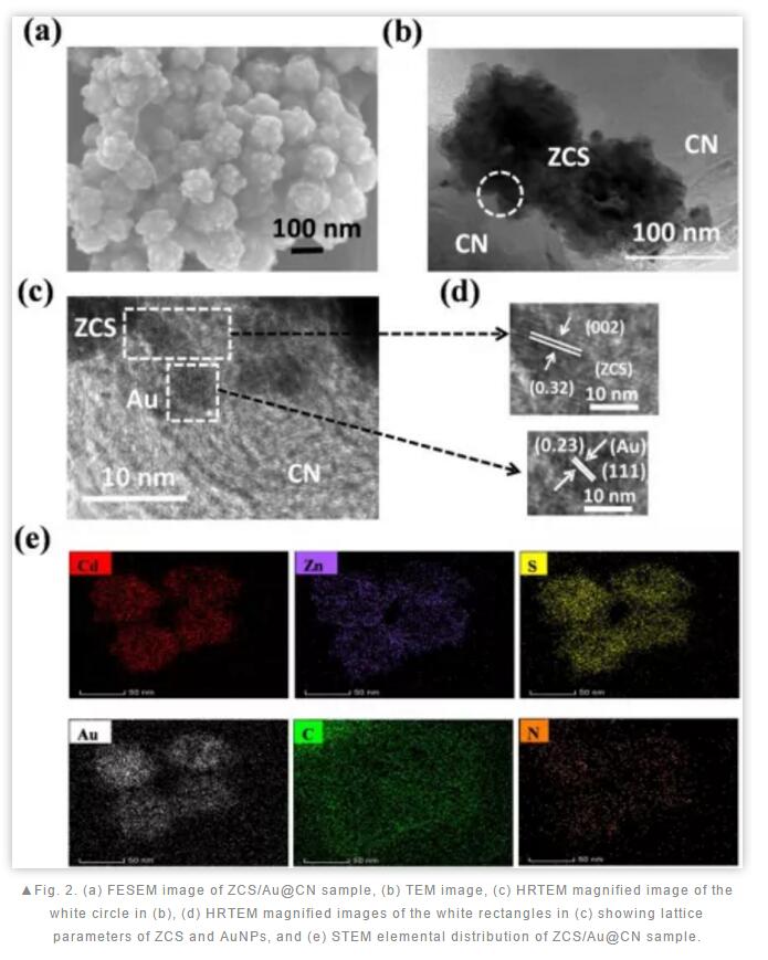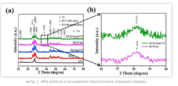 如圖1中的XRD譜圖所示,CN有兩個明顯的衍射峰,在2θ = 27.6°時峰值與g-C3N4在(002)衍射面層間的堆積有關,在2θ = 12.7°處(100)面的衍射峰則是由于在平面內的tri-s-triazine的重復單元。共軛芳香族體系的(002)衍射峰比之前報道的g-C3N4的衍射峰要強,這表明,巴比妥酸的加入大大提高了制備的CN的結晶度,結晶度的增加可以加速電子在晶面的轉移,提高光催化活性。ZCS固溶體樣品的衍射圖形為典型的六邊形和立方結構,在(100),(002),(101),(110),(103),(112),(202)面上具有顯著的峰,而(111)、(200)、(311)面與ZCS立方相匹配。此外,所制備的ZCS納米球的衍射峰明顯而尖銳,表現(xiàn)出異常的結晶性質。沒有額外雜質,表明制備樣品的相純度高。ZCS/Au和ZCS/Au@CN復合材料的衍射峰與純ZCS和CN的衍射峰相似。結果表明,在AuNPs光沉積過程中,ZCS或CN的相結構沒有發(fā)生變化。在ZCS/Au@CN樣品中,CN的衍射強度相對較低,原因是其在復合材料中的含量較低(5% wt%)。通過進一步的HRTEM、XPS分析和UV-Vis中的波段漂移,可以發(fā)現(xiàn)制備樣品中AuNPs和CN的清晰存在(圖2)。