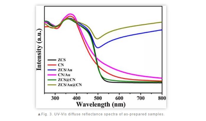 為了研究制備的光催化劑的捕光性能和CO2還原性能,我們記錄了所有制備樣品的UV-vis DRS光譜。從圖3可以看出,ZCS及CN在300-500nm有很強的強度,說明在可見光照射的情況下,兩個樣品都可以被激發(fā)。即使CN在ZCS表面沉積后,ZCS@CN的吸收強度也沒有明顯變化。它只顯示在可見光范圍內的吸收有輕微的紅移,而紫外吸收略有下降。然而,ZCS和ZCS@CN在波長短于523nm時顯示出很強的吸收。這個結果表明CN是在表面上積累的,而不是在ZCS納米球的晶格內。與純CN相比,在CN/Au樣品中引入AuNPs后,可見光區(qū)的光吸收得到了改善。與純ZCS相比,ZCS/Au和ZCS/Au@CN樣品在可見光區(qū)表現(xiàn)出很強的光吸附性能,尤其是在500 - 800nm處,這一事實反映了AuNPs和ZCS階段之間的強烈交互作用。這種吸收向長波長的轉移與ZCS價帶到AuNPs表面的直接界面電荷遷移率有關。這一觀察結果表明,制備的復合材料樣品同樣可以在完全可見光范圍內被激發(fā)。