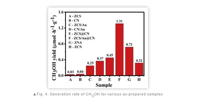 圖4顯示了已制備樣品在可見光照射下(1h)的光催化生成甲醇情況。純ZCS和CN的光催化活性較低,這可能是由于光生載流子的快速重組所致。而所有復合樣品都比原始ZCS和CN具有更高的光催化活性。全固態(tài)ZCS/Au@CN催化劑Z使得光催化還原CO2的最大產甲醇量為1.31 μmolh?1g?1,比ZCS (0.03 μmolh?1g?1)和CN (0.04 μmolh?1g?1)樣品分別提高了43.6倍和32.7倍。結果表明,ZCS和CN光催化劑的負載AuNPs快速促進了載流子的分離,提高了光催化CO2還原活性。此外,物理混合催化劑(ZCN和 ZNA)的光催化CO2還原活性遠低于ZCS/Au@CN催化劑,說明三組分之間的化學鍵合對提高CO2還原中的光催化活性至關重要。