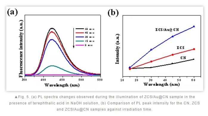 通過用苯二甲酸(TA)合成2-羥基對苯二甲酸(HTA),在325nm的激發(fā)波長下進行了室溫光致發(fā)光(PL)光譜分析。羥基自由基捕獲測試被認為是驗證直接Z-Scheme光催化劑的最重要的方法之一,其中,OH-/H2O可以通過與半導體上的光生空穴反應生成?OH自由基。ZCS/Au@CN光催化劑在不同光照時間下的PL光譜變化如圖5a所示。樣品中HTA的PL強度隨光照射時間的增加而增加。這一效應表明,CN上的光生成空穴沒有足夠的氧化電位與OH-/H2O反應生成?OH自由基,這表明光生成空穴在ZCS表面積累,如圖5b。