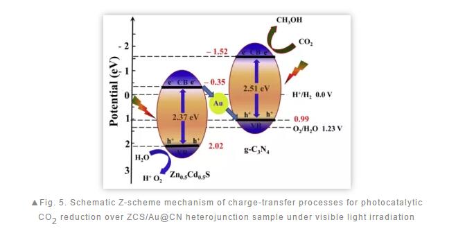 如圖6所示,ZCS和CN的導帶(CB)是-0.35和-1.52 eV,比標準的CO2/ CH3OH氧化還原電勢更負,而ZCS和CN的價帶(VB)是2.02和0.99 eV,比標準的O2 / H2O氧化還原電勢更正。因此,從熱力學角度看,在可見光照射下,ZCS和CN都能光激發(fā)并將CO2還原為CH3OH或CH4。然而,如圖4所示,ZCS和CN在光照1h后都不能產生足夠的CH3OH。這一事實表明,在純ZCS和CN中,光致電子的有效收集和分離是不可行的。具體而言,三元體系中光催化CO2減排增強活性可能有兩種機制:(1)傳統(tǒng)II型異質結和(2)直接Z-Scheme。在第一類普通電荷轉移體系中,光子輻照后,CN的CB中的光激發(fā)電子遷移到ZCS的CB中,ZCS的VB中的空穴遷移到CN的VB中。在這個過程中,電子-空穴對是空間分離的。而ZCS的CB和CN的VB中積累的電子和空穴具有較低的還原氧化電位。因此,整體光催化劑的氧化還原能力大大降低。相比之下,在第二種體系中,兩種催化劑在開放的可見光照射下都被光激發(fā)產生電子和空穴。ZCS、Au、CN界面在光照射前形成了費米能級平衡,ZCS的CB上的電子在光照射后迅速遷移到AuNPs。因此,CN的CB中積累的勢能高的電子可以還原CO2生成CH3OH,而ZCS的VB中留下的空穴可以實現(xiàn)光氧化過程生成H+和O2自由基。值得注意的是,這種類型的電荷轉移途徑保留了ZCS更正的VB上的光生空穴和CN更負的CB上的電子,這可能不僅顯著增強了載流子的分離,而且抑制了載流子的重組。從能帶結構分析、ESR結果、CO2還原活性的增強、分離效率的提高以及氧化還原能力的增強來看,ZCS與CN光催化劑之間形成直接Z-Scheme機制比形成傳統(tǒng)II型異質結更有利。