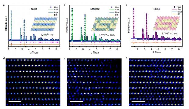 圖1 通過HEXRD精修和像差校正高分辨率TEM進行定量原子占用率分析。(a)NC64、(b)NMC622和(c)NM64樣品的HEXRD衍射和精修;原子級觀測(d)NC64、(e)NMC622和(f)NM64樣品的TEM圖像。