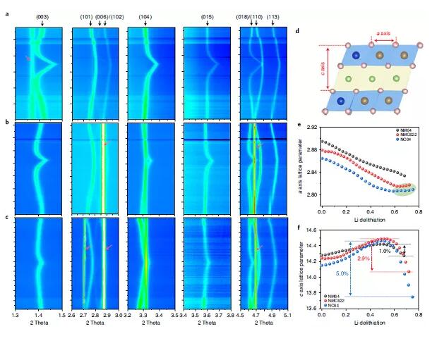 圖2 三種正極首次充放電過程中的原位HEXRD表征。原位HEXRD顯示(a)NC64、(b)NMC622和(c)NM64正極結構演化的等高線圖;(d)層狀氧化物材料典型晶格參數(shù)示意圖;(e)從精修結果中得到的樣品中a-軸晶格參數(shù)的變化;(f)從精修結果中得到的樣品中c-軸晶格參數(shù)的變化。