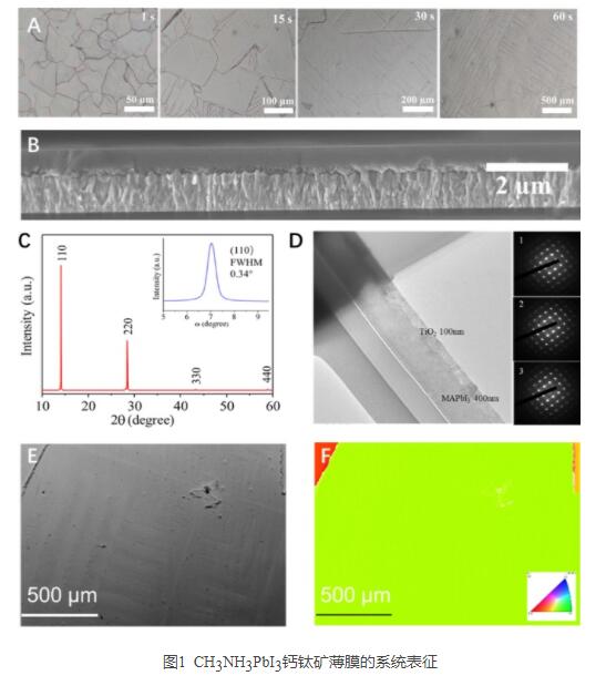 最近,課題組與天津大學(xué)科研人員合作,利用甲胺輔助重結(jié)晶方法原位制備CH3NH3PbI3鈣鈦礦薄膜,制備的鈣鈦礦薄膜厚度僅幾百納米,晶粒達(dá)到1-2 mm, 同時鈣鈦礦薄膜具有單一的(110)取向,他們利用SEM,XRD,TEM和EBSD對鈣鈦礦薄膜進(jìn)行系統(tǒng)的表征。制備的鈣鈦礦薄膜具有較低的缺陷態(tài)密度和較長的載流子壽命,對應(yīng)的光伏電池光電轉(zhuǎn)化效率達(dá)到21.36%,該研究成果近日發(fā)表于Nat. Commun. (2020, 11:5402),通訊聯(lián)系人是蔣克健副研究員、宋延林研究員和天津大學(xué)周雪琴教授,第一作者是碩士生范昊宸和李鳳珠。
