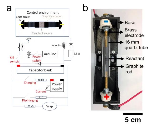 圖2. 閃速焦耳加熱裝置電路圖及實(shí)物。圖片來源:Adv. Mater.