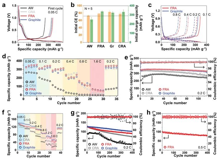圖5. 閃熱回收石墨負(fù)極的電化學(xué)性能。圖片來源:Adv. Mater.