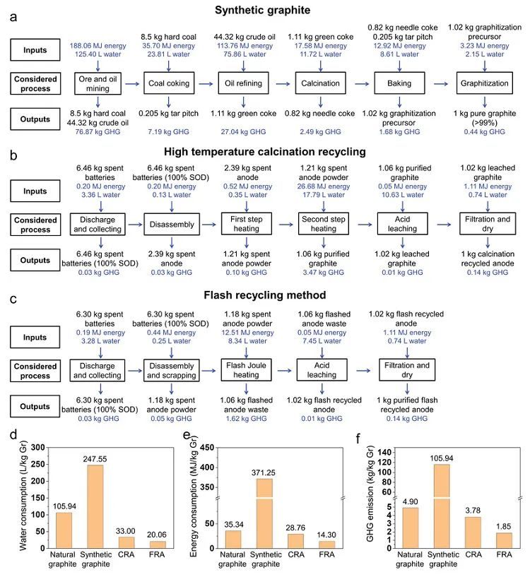 近日,美國(guó)萊斯大學(xué)James M. Tour教授課題組提出了一種超快的“閃熱回收(flash recycling)”方法再生石墨負(fù)極,同時(shí)還可回收寶貴的電池金屬資源。他們使用的關(guān)鍵技術(shù)是此前發(fā)過Nature 的閃速焦耳加熱(flash Joule heating, FJH),通過高壓放電在不到1秒的時(shí)間內(nèi)就可達(dá)到3000 K以上的高溫,以快速制備石墨烯(Nature, 2020, 577, 647,點(diǎn)擊閱讀詳細(xì))。在本文中,他們將這項(xiàng)技術(shù)進(jìn)行了調(diào)整,用于再生石墨負(fù)極。僅需幾秒鐘的選擇性焦耳加熱,廢石墨負(fù)極中的電阻性雜質(zhì)就被有效分解。產(chǎn)生的無機(jī)鹽,包括Li、Co、Ni和Mn,可以使用稀釋的酸(0.1 M HCl)很容易地從處理過的廢負(fù)極中回收。與使用高溫煅燒方法回收的負(fù)極材料相比,閃熱回收的負(fù)極保留了石墨結(jié)構(gòu),并且外覆一層固體電解質(zhì)界面(SEI)衍生的碳?xì)?,使其具有?yōu)良的電化學(xué)性能,完全可以再次用于鋰離子電池。對(duì)現(xiàn)有石墨生產(chǎn)和回收方法的生命周期分析表明,閃熱回收可以顯著降低總能耗和溫室氣體排放,同時(shí)使負(fù)極回收成為在經(jīng)濟(jì)上有利的過程。相關(guān)論文發(fā)表于Advanced Materials 雜志。