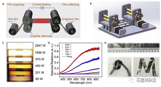 Figure 1. (a)連續(xù)電熱示意圖,(b)連續(xù)電熱裝置,(c)石墨烯膜電熱過程中的照片,(d)不同溫度的光譜圖,(e)所制備的柔性石墨烯導(dǎo)熱膜。