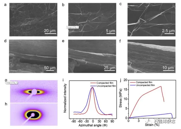 Figure 2. (a-c)石墨烯膜的表面形貌,(d-f)石墨烯膜的斷面形貌,(g)連續(xù)輥壓的電熱處理石墨烯膜的SAXS圖案,(h)未輥壓的石墨烯膜的SAXS圖案,(i)對應(yīng)的SAXS方位角積分曲線,(j)石墨烯膜的力學(xué)性能。