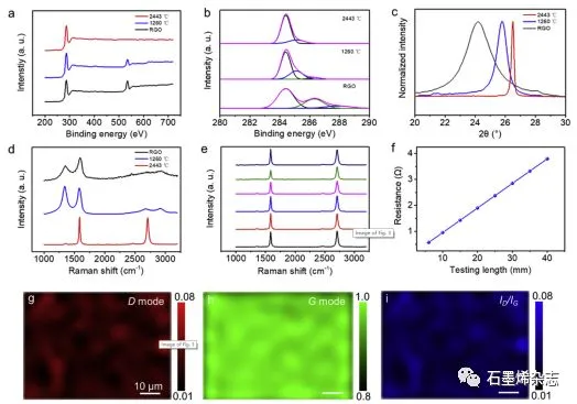 Figure 3.不同電熱溫度熱處理石墨烯膜的(a,b)XPS、(c)XRD、(d)Raman表征;(e)石墨烯膜不同位置的拉曼光譜,間隔距離為1cm;(f)石墨烯膜電阻與測試長度的關(guān)系,表明制備的石墨烯膜宏觀尺寸均勻;(g-i)石墨烯膜的拉曼成像掃描,證明石墨烯膜微觀尺寸結(jié)構(gòu)均勻。