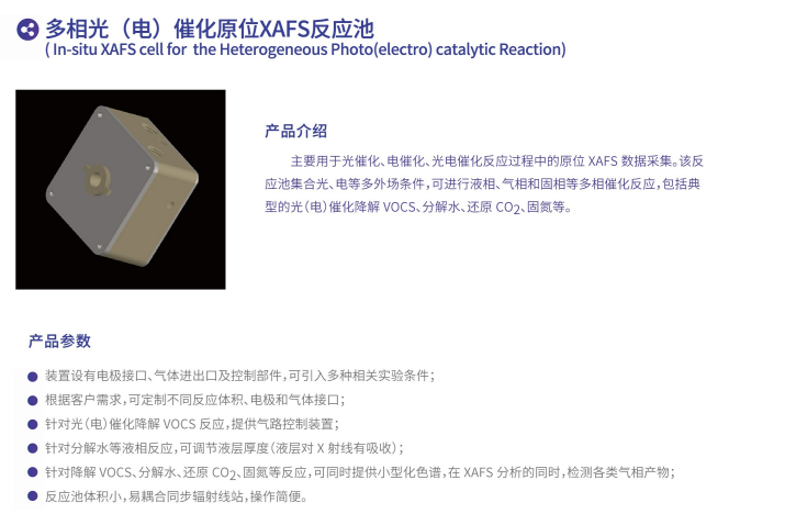 多相光(電)催化原位XAFS反應(yīng)池主要用于光催化、電催化、光電催化反應(yīng)過程中的原位 XAFS數(shù)據(jù)采集。該反應(yīng)池集合光、電等多外場條件,可進行液相、氣相和固相等多相催化反應(yīng),包括典型的光(電 )催化降解 VOCS、分解水、還掉 CO2 、固氮等。