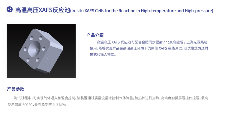 高溫高壓XAFS反應(yīng)池可配合合肥同步輻射,北京高能所,上海光源線站使用,能夠?qū)崿F(xiàn)樣品在高溫高壓環(huán)境下的原位XAFS在線測(cè)試,測(cè)試模式為透射模式和掠入模式。