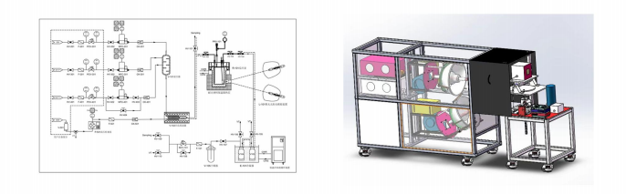 本裝置配置三路氣體進(jìn)料和一路液體進(jìn)料,使用聚光太陽(yáng)能模擬裝置做為光源和熱源,高溫高壓反應(yīng)釜做為反應(yīng)器??稍u(píng)價(jià)多種原料