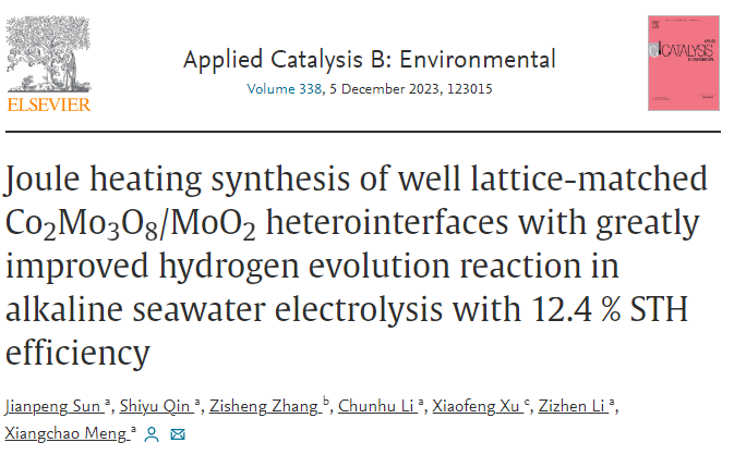 通訊作者:孟祥超; 通訊單位:中國海洋大學(xué); 原文鏈接:https://doi.org/10.1016/j.apcatb.2023.123015 全文速覽 在此,我們通過快速焦耳加熱方法,僅用130秒就成功在泡沫鎳上制備了晶格匹配良好的Co2Mo3O8/MoO2異質(zhì)界面。值得注意的是,快速焦耳加熱可以有效避免長時間加熱引起的催化劑氧化,并獲得豐富不配位Mo4+位點,這有助于提高HER的電催化性能。制備的Co2Mo3O8/MoO2具有與Pt基電催化劑相當(dāng)?shù)腍ER活性(在10 mA cm?2下為23 mV)。同時樣品在200小時的測試中也顯示出在堿性海水電解中優(yōu)異的穩(wěn)定性。值得注意的是,太陽能驅(qū)動的H2O-H2電解槽還顯示出12.4%的太陽能-氫氣(STH)效率。國產(chǎn)陰離子交換膜(AEM)海水電解槽的池電壓在50°C下200 mA·cm?2時僅為2.13 V,生產(chǎn)1 m3 H2僅需4.7 kW-h。DFT計算表明,電子自發(fā)分布在Co2Mo3O8/MoO2異質(zhì)界面的Co–O–Mo鍵上,可以調(diào)節(jié)Mo位點的電子結(jié)構(gòu)和d帶中心,從而實現(xiàn)H2O在Mo位點的高效吸附和O位點接近零的氫吸附自由能。這項研究提供了一種通過焦耳熱調(diào)節(jié)化學(xué)態(tài)的新策略,以高效分解海水釋放H2。 背景介紹 電催化海水分解作為一種有效的氫氣生產(chǎn)方法,被認為是解決淡水短缺危機和滿足未來全球能源需求的一種很有前途的替代方案。二氧化鉬(MoO2)作為HER電催化劑,以其良好的導(dǎo)電性、耐腐蝕性而日益受到人們的關(guān)注。然而,由于暴露不足和活性位點反應(yīng)動力學(xué)差,MoO2的電催化活性需要進一步提高才能得到廣泛應(yīng)用。通常,MoO2的電催化活性由水的吸附和氫從表面Mo位點或O位點的解吸決定。界面工程作為一種有效的方法,可以直接調(diào)節(jié)界面上的Mo-O鍵,然后調(diào)整結(jié)合能,從而加速H2的產(chǎn)生。 近年來,焦耳熱效應(yīng)被應(yīng)用于快速合成新材料,材料可以在超高溫(>2000?K) 短時間內(nèi)(≈12?ms)快速合成,并避免在長時間加熱過程中活性位點的堆積。同時,快速冷卻也容易導(dǎo)致結(jié)構(gòu)畸變和晶格應(yīng)變,從而提供豐富的不配位催化位點。因此,快速焦耳加熱有望彌補傳統(tǒng)加熱過程中催化劑界面上活性位點的氧化、聚集和失活問題,并可能實現(xiàn)豐富的不配位Mo位點。然而,尚未對焦耳加熱效應(yīng)進行相關(guān)研究來設(shè)計和合成MoO2基電催化劑。此外,泡沫鎳(NF)和泡沫銅(CF)的使用可以有效地避免粉末催化劑容易脫落的問題。三維(3D)形態(tài)、空穴結(jié)構(gòu)和導(dǎo)電基底可以提高比表面積,加速電子轉(zhuǎn)移,增加活性位點,有利于H2的釋放。 研究目標(biāo) 在這里,我們通過快速焦耳加熱構(gòu)建了一種新型的在泡沫鎳上晶格匹配良好的富含非配位Mo4+位點的Co2Mo3O8/MoO2/NF電催化劑。在焦耳加熱過程中,Co2Mo3O8/MoO2/NF暴露出豐富的Co2Mo3O8和MoO2相容界面和晶格位錯,這可以導(dǎo)致異質(zhì)界面上的電子重排,增強界面上的Mo-O鍵,從而優(yōu)化活性位點的活性。結(jié)果表明,Co2Mo3O8/MoO2/NF在海水裂解和陰離子交換膜(AEM)海水電解槽中表現(xiàn)出優(yōu)異的HER活性和穩(wěn)定性。最后,通過實驗和理論研究,探討了制備樣品的機理。 總結(jié)與展望 總之,通過快速焦耳加熱和氫還原方法在泡沫鎳基底上制備了晶格匹配良好的Co2Mo3O8/MoO2異質(zhì)界面。高溫快速處理促進了晶格匹配的Co2Mo3O8/MoO2/NF的形成,增強了豐富的非配位Mo4+位點,調(diào)節(jié)了O原子的電子結(jié)構(gòu)。電化學(xué)測量表明,Co2Mo3O8/MoO2/NF提供了較低的過電位。