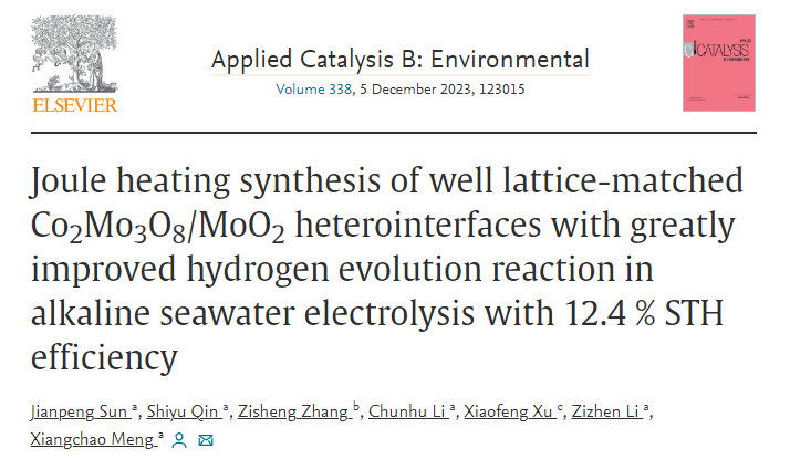 近日,中國海洋大學(xué)孟祥超教授科研團(tuán)隊(duì)在JMCA和ACB期刊分別發(fā)表了題為“Rapid synthesis of efficient Mo-based electrocatalyst for the hydrogen evolution reaction in alkaline seawater with 11.28% solar-to-hydrogen efficiency”和“Joule heating synthesis of well lattice-matched Co2Mo3O8/MoO2 heterointerfaces with greatly improved hydrogen evolution reaction in alkaline seawater electrolysis with 12.4 % STH efficiency”的研究成果。