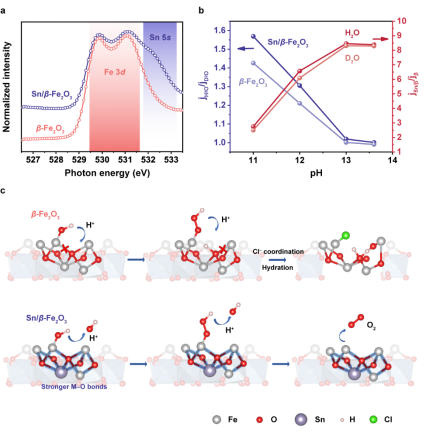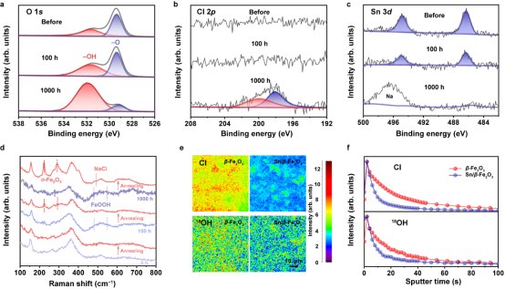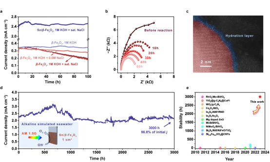 論文中提出了晶格中的Sn增強(qiáng)金屬-氧相互作用的原理,Sn的存在顯著增強(qiáng)了M-O鍵的強(qiáng)度,防止反應(yīng)中間體局部高濃度的質(zhì)子對(duì)晶格的攻擊,提高了晶體結(jié)構(gòu)的穩(wěn)定性。制備的Sn/β-Fe2O3光陽(yáng)極在長(zhǎng)時(shí)間反應(yīng)后僅在淺層表面檢測(cè)到重構(gòu)的發(fā)生和Cl?的吸附。在模擬海水電解液中工作3000小時(shí)后,光電流仍然保持在初始值的96.8%,是目前世界上穩(wěn)定性最高的光陽(yáng)極材料。此外,該工作對(duì)材料在海水中腐蝕機(jī)理的探究,以及在防腐蝕領(lǐng)域的探索也具有重要意義。